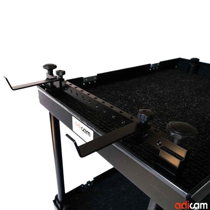 - The Dual Tripod Holder is mounted on the top shelf, always on the narrow side of the cart, above the small transport wheels