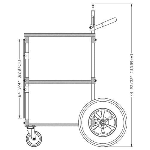 The Transformer Cart is a fully collapsible cart used for Video, Sound and Remote Head. It is held together by four vertical posts which attach to a Bottom, Middle and Top Shelf by using telescopic locks operated with a 5/32 Allen wrench. All accessories are attached in the same manner. Middle Shelf, Handles, Rack Mounts and all available accessories can be adjusted to your desired height. Additional Rack Mounts may be installed on rear section of cart for additional accessories. Custom size vertical poles may be ordered to change height of cart.