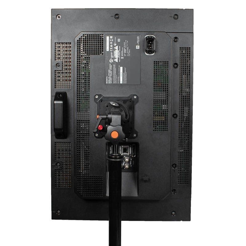 The MMS09 VESA Monitor Mount to 5/8" Spigot – Ball-Loc – QR-L/P supports broadcast & production quality monitors up to 77 lb/35kg, designed specifically for mobile cart/truck applications. Chosen by professionals & rental houses to mount VESA standard monitors to 5/8" (16mm) baby pins.