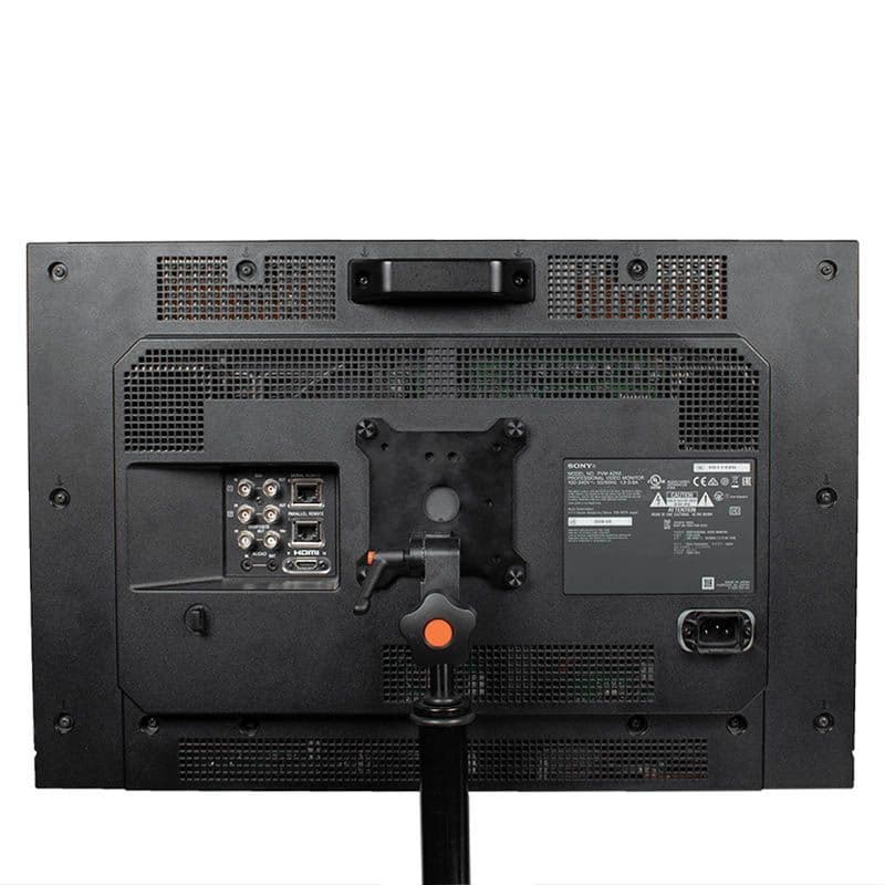 The MMS09 VESA Monitor Mount to 5/8" Spigot – Ball-Loc – Standard supports broadcast & production quality monitors up to 77 lb/35kg, designed specifically for mobile cart/truck applications. Chosen by professionals & rental houses to mount VESA standard monitors to 5/8” (16mm) baby pins.